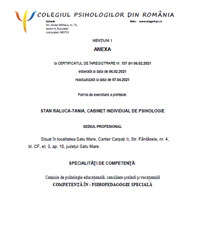 2020 - Prezent - Logoped Satu Mare - Cabinet Individual de Psihologie Stan Raluca-Tania (Specializare: Psihopedagogie Specială) - Logoped acreditat Colegiul Psihologilor din România, Satu-Mare